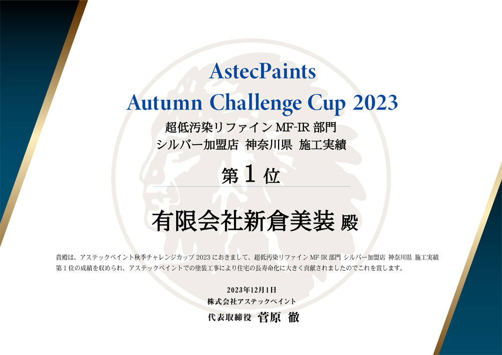有限会社新倉美装は、建築用塗料メーカー『株式会社アステックペイント』において、2023年の施工実績で神奈川県第1位を獲得いたしました。